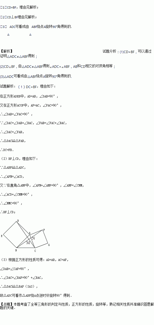 以△ABC的AB、AC为边分别作正方形ADEB、ACGF,连接DC、BF: