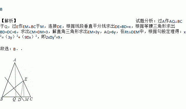 如图,在△ABC中,AB=AC,BC=12,E为AC边的中点,线段BE的垂直平分线交边BC于点D.设BD=x,tan∠ACB=y,则( )