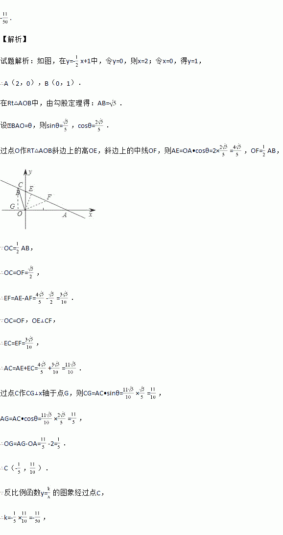 如图,在以点O为原点的直角坐标系中,一次函数y=-x+1的图象与x轴交于A,与y轴交于点B,点C在第二象限内且为直线AB上一点,OC=AB,反比例函数y=的图象经过点C,则k的值为 .