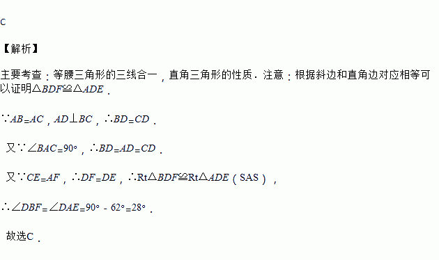 如图,在Rt△ABC中,∠BAC=90°,AB=AC,AD⊥BC,垂足为D、E,F分别是CD,AD上的点,且CE=AF.如果∠AED=62°,那么∠DBF的度数为( )