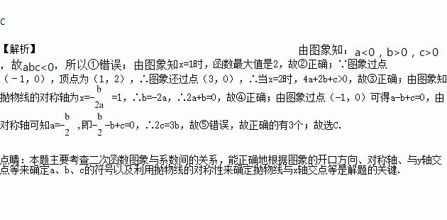 ①abc>0;②x=1时,函数最大值是2;③4a+2b+c>0;④2a+b=0;⑤2c<3b.