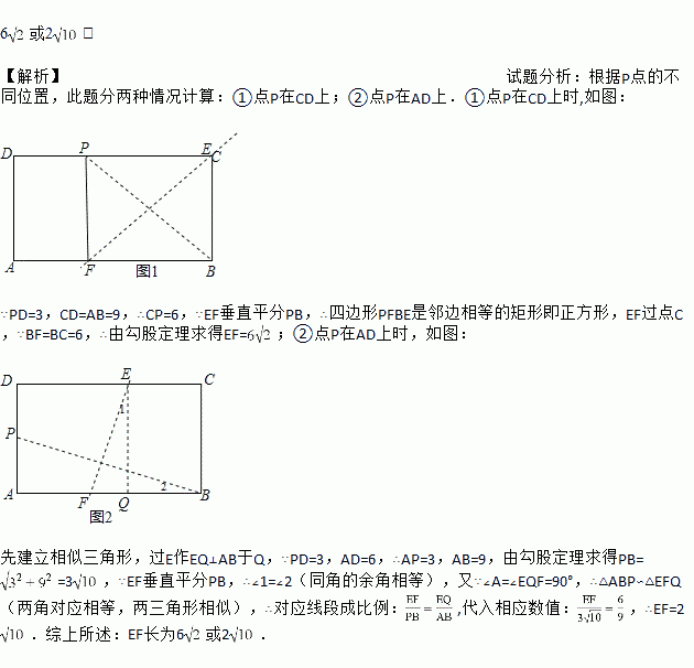 矩形纸片ABCD,AB=9,BC=6,在矩形边上有一点P,且DP=3.将矩形纸片折叠,使点B与点P重合,折痕所在直线交矩形两边于点E,F,则EF长为_____.
