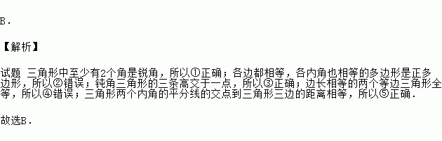 下列说法中:①三角形中至少有2个角是锐角;②各边都相等的多边形是正多边形;③钝角三角形的三条高交于一点;④两个等边三角形全等;⑤三角形两个内角的平分线的交点到三角形三边的距离相等,正确的个数是( )