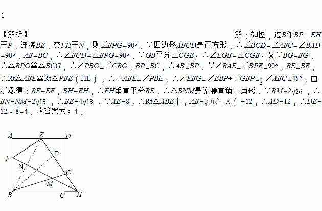 正方形ABCD中,F是AB上一点,H是BC延长线上一点,连接FH,将△FBH沿FH翻折,使点B的对应点E落在AD上,EH与CD交于点G,连接BG交FH于点M,当GB平分∠CGE时,BM=2