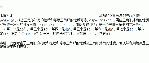 如图,∠AOB是一角度为10°的钢架,要使钢架更加牢固,需在其内部添加一些钢管:EF、FG、GH…,且OE=EF=FG=GH…,在OA、OB足够长的情况下,最多能添加这样的钢管的根数为 _________.
