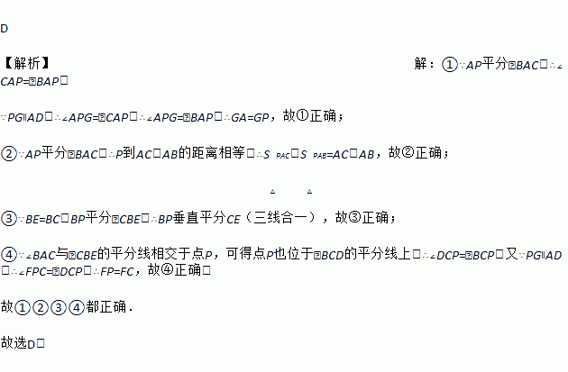 如图,∠BAC与∠CBE的平分线相交于点P,BE=BC,PB与CE交于点H,PG∥AD交BC于F,交AB于G,下列结论:① GA=GP;② S△PAC∶S△PAB=AC∶AB;③ BP垂直平分CE;④ FP=FC,其中正确的判断有( )