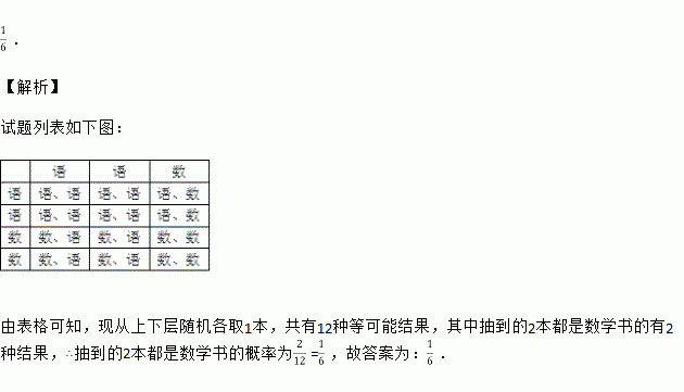 一书架有上下两层,其中上层有2本语文1本数学,下层有2本语文2本数学,现从上下层随机各取1本,则抽到的2本都是数学书的概率为 .