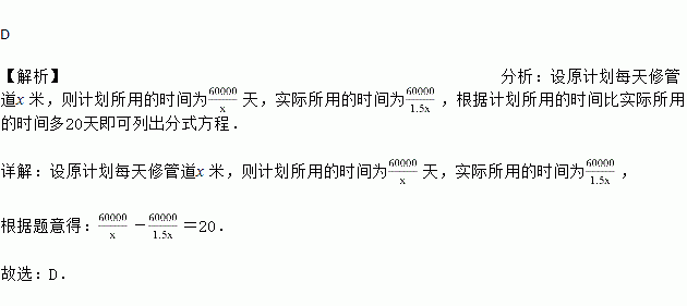 我市为实行土地灌溉高效节水计划,增加高效节水灌溉面积,决定新建用水管道60000米,为使管道能尽快投入使用,实际工作效率是原计划工作效率的1.5 倍,结果提前20天完成任务.问原计划每天修管道多少米?若设原计划每天修管道x 米,根据题意列出方程得( )