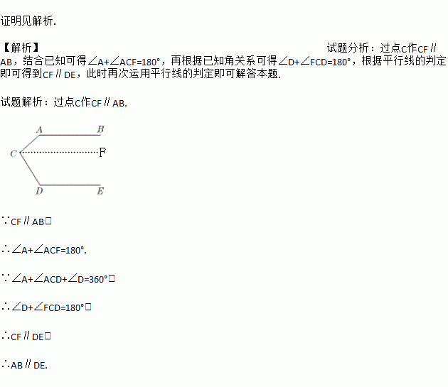 如图,已知∠A+∠ACD+∠D=360°,试说明:AB∥DE.