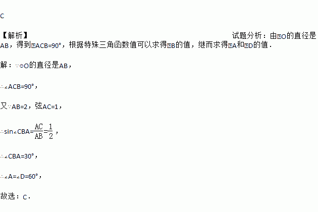 C ¡¾½âÎö¡¿ÊÔÌâ·ÖÎö£ºÓÉ¡ÑOµÄÖ±¾¶ÊÇAB£¬µÃµ½¡ÏACB=90¡ã£¬¸ù¾ÝÌØÊâÈý½Çº¯ÊýÖµ¿ÉÒÔÇóµÃ¡ÏBµÄÖµ£¬¼Ì¶øÇóµÃ¡ÏAºÍ¡ÏDµÄÖµ£® ¡¾½âÎö¡¿ ¡ß¡ÑOµÄÖ±¾¶ÊÇAB£¬ ¡à¡ÏACB=90¡ã£¬ ÓÖ¡ßAB=2£¬ÏÒAC=1£¬ ¡àsin¡ÏCBA=£¬ ¡à¡ÏCBA=30¡ã£¬ ¡à¡ÏA=¡ÏD=60¡ã£¬ ¹ÊÑ¡£ºC£®