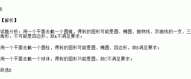 B 【解析】 试题分析:用一个平面去截一个圆锥,得到的图形可能是圆、椭圆、抛物线、双曲线的一支、三角形,不可能是四边形,故A不满足要求; 用一个平面去截一个圆柱,得到的图形可能是圆、椭圆、四边形,故B满足要求; 用一个平面去截一个球体,得到的图形只能是圆,故C不满足要求; 故选B