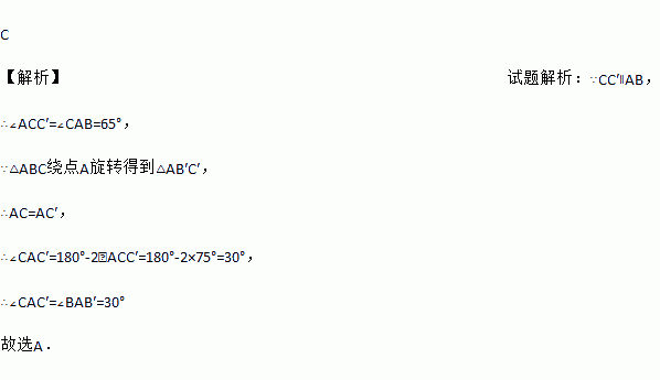 如图,在△ABC中,∠CAB=65°,将△ABC在平面内绕点A旋转到△AB′C′的位置,使CC′∥AB,则旋转角的度数为( )