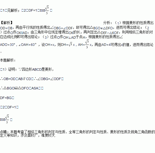 如图,在菱形ABCD中,AB=4,对角线AC、BD交于O点,E为AD延长线上一点,DE=2,直线OE分别交AB、CD于G、F。