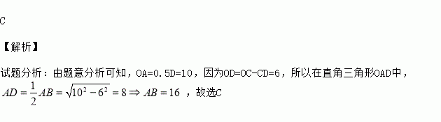 如图,AB是⊙O的弦, OC⊥AB于点D,交⊙O于点C,若⊙O的半径为10,CD=4,那么AB的长为( )