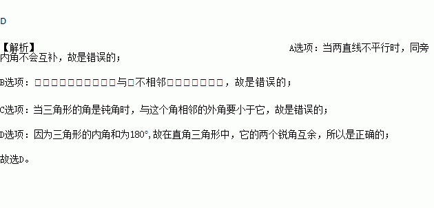 C. 三角形的一个外角大于内角 D. 直角三角形的两锐角互余