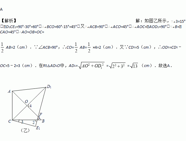 把一副三角板如图放置 其中∠ACB=∠DEC=90º,∠A=45º,∠D=30º,斜边 AB=4,CD=5,把三角板DCE绕点C顺时针旋转15º得到三角形D1CE (如图二),此时AB与CD1交于点O,则线段AD1的长度为( )