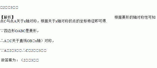 如图,在菱形OABC中,点B在x轴上,点A的标为(2,3),则点C的坐标为__.