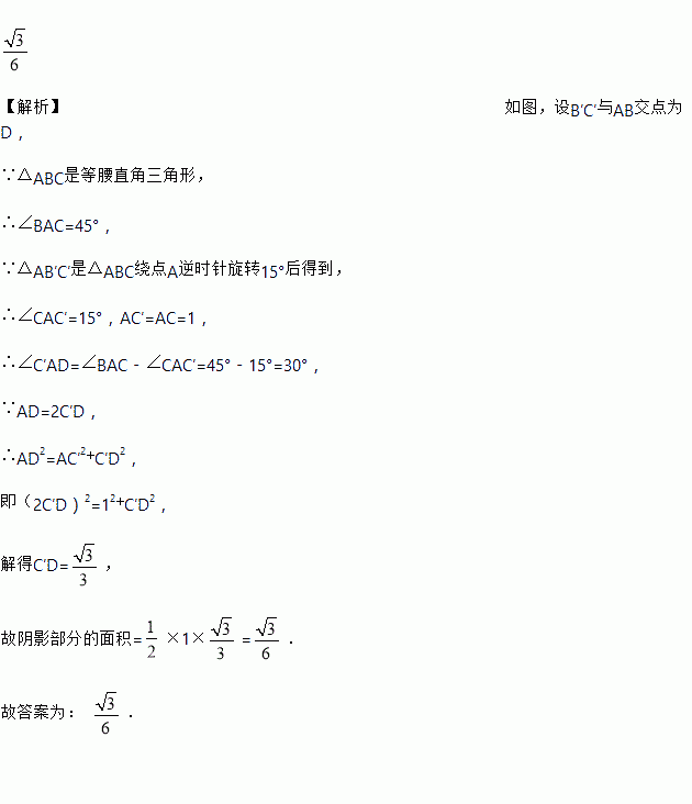如图,将等腰直角三角形ABC绕点A逆时针旋转15°后得到△AB′C′,若AC=1,则图中阴影部分的面积为_____.
