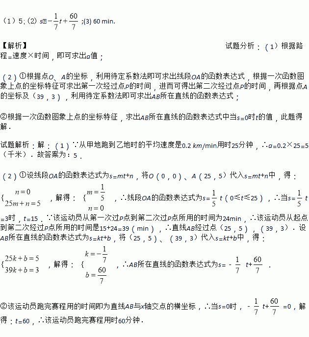 某市举行长跑比赛,运动员从甲地出发跑到乙地后,又沿原路线跑回起点甲地.如图是某运 动员离开甲地的路程 s(km)与跑步时间 t(min)之间的函数关系(OA、OB 均为线段).已 知该运动员从甲地跑到乙地时的平均速度是 0.2 km/min,根据图像提供的信息,解答下列问 题: