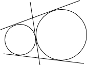 解:如图,当两圆外切时,内公切线有1条,外公切线有2条,
