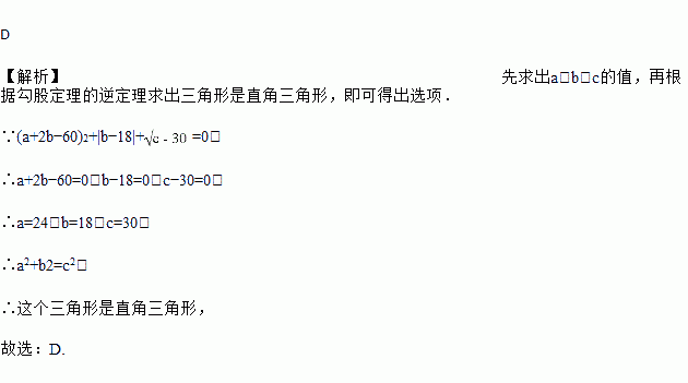 三角形的三边长a,b,c满足关系式(a+2b﹣60)2+|b﹣18|+=0,则这个三角形是( )