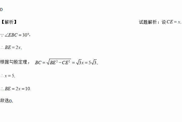 如图,已知正方形ABCD的边长为5,E为BC边上的一点,∠EBC=30°,则BE的长为 ( )