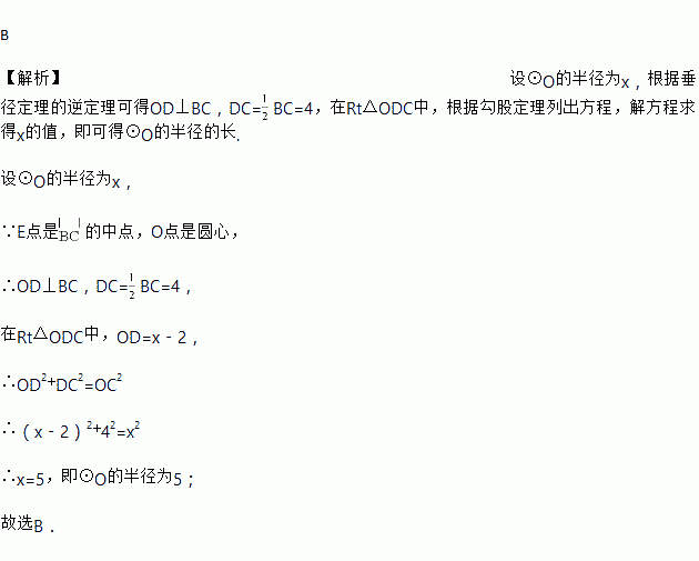 如图,AB是半圆O的直径,E是弧BC的中点,OE交弦BC于点D,过点C作⊙O切线交OE的延长线于点F,已知BC=8,DE=2,则⊙O的半径为( )