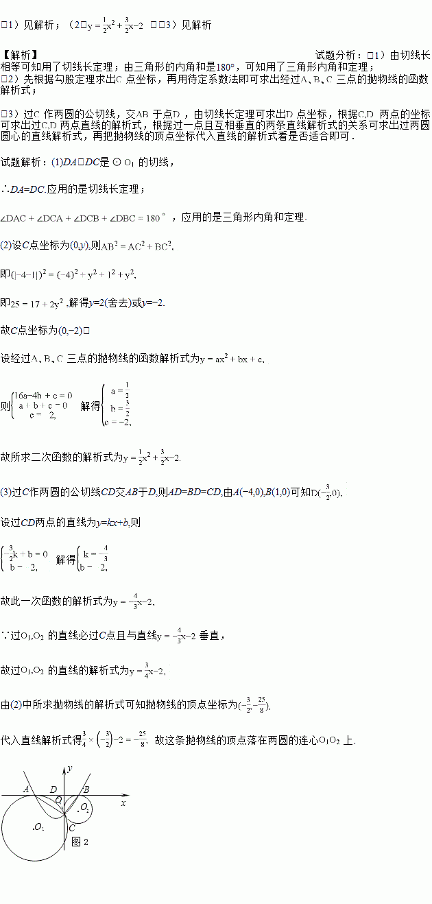 (3)根据(2)中所确定的抛物线,试判断这条抛物线的顶点是否落在两圆的连心O1O2上,并说明理由.