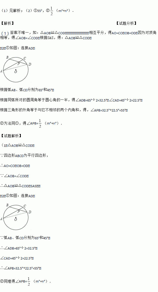 ②一般地,在⊙O中,弦AC、BD相交于点P,若弧AB、弧CD分别为m°和n°,求∠APB.
