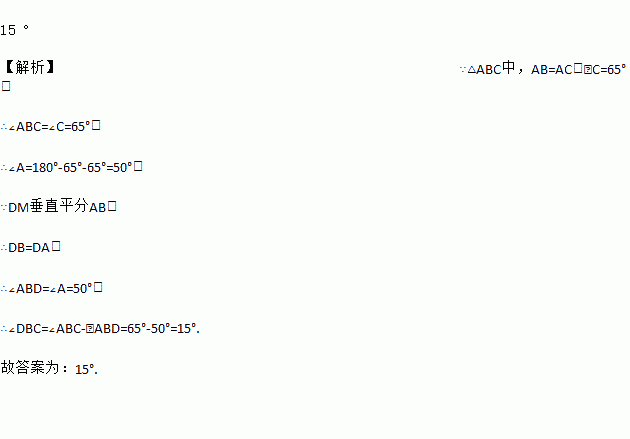 如图,等腰△ABC中,AB=AC,∠C=65°,AB的垂直平分线MN交AC于点D,则∠DBC的度数是_____.