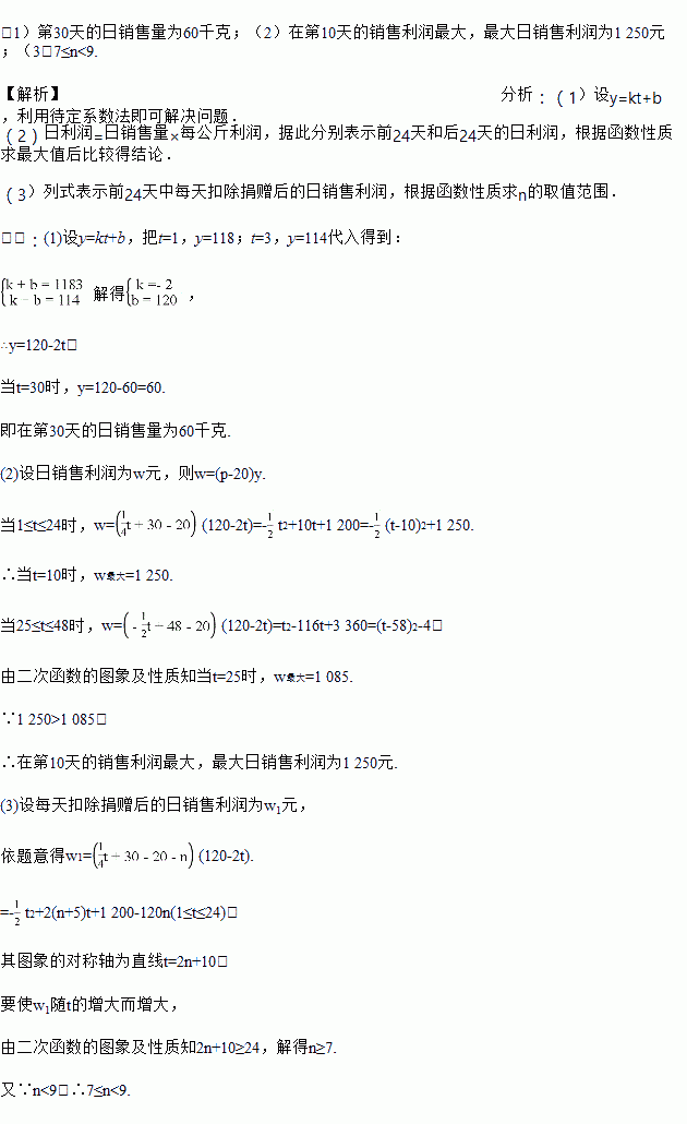(3)在实际销售的前24天中,公司决定每销售1 kg水果就捐赠n元利润(n<9)给“精准扶贫”对象,现发现:在前24天中,每天扣除捐赠后的日销售利润随时间t的增大而增大,求n的取值范围.