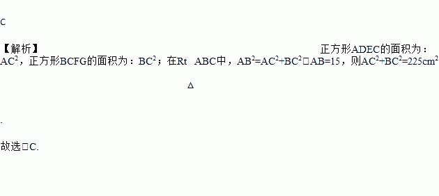 如图,Rt△ABC中,∠ACB=90°,若AB=15cm,则正方形ADEC和正方形BCFG的面积和为( )