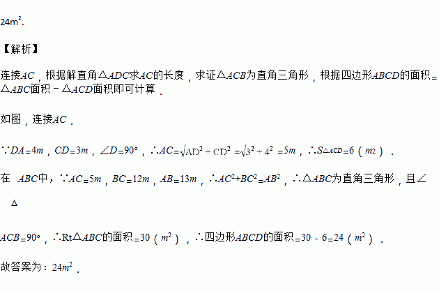如图,有一块四边形田地ABCD,∠D=90°,AB=13m,BC=12m,CD=3m,DA=4m,则该四边形田地ABCD的面积为_____.