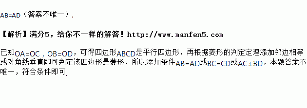如图,在四边形ABCD中,对角线AC,BD交于点O,OA=OC,OB=OD,添加一个条件使四边形ABCD是菱形,那么所添加的条件可以是 (写出一个即可).