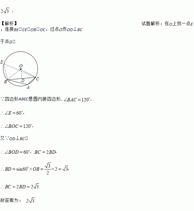 如图,⊙O是△ABC的外接圆,∠BAC=120°,若⊙O的半径为2,则弦BC的长为__________.