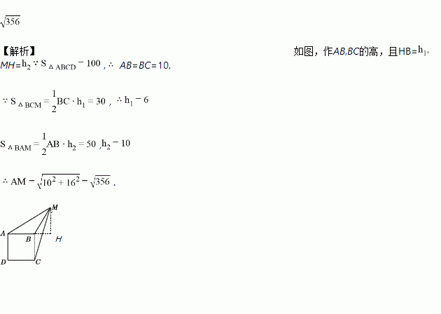 如图,正方形ABCD外有一点M,连结AM,BM,CM.若△AMB,△BMC和正方形ABCD的面积分别是50 cm2,30 cm2和100 cm2,则AM=________cm.