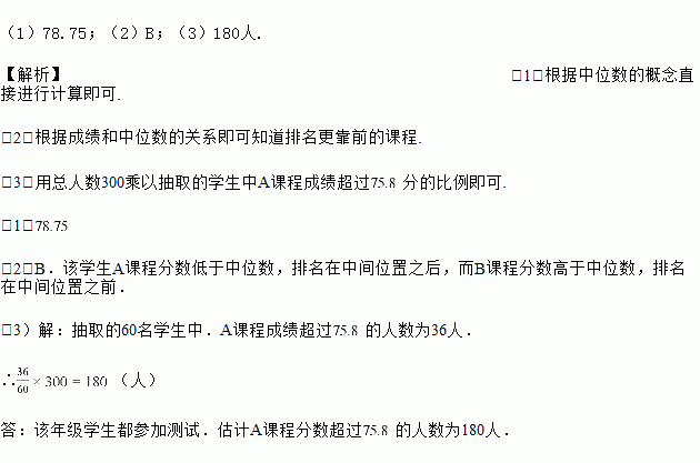 (3)假设该年级学生都参加此次测试,估计A课程成绩超过分的人数.![]()