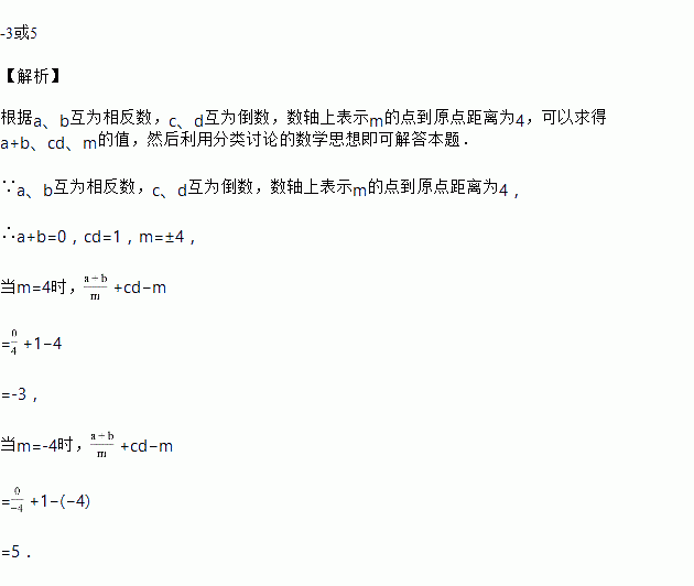 a、b互为相反数,c、d互为倒数,数轴上表示m的点到原点距离为4,求+cd-m的值.