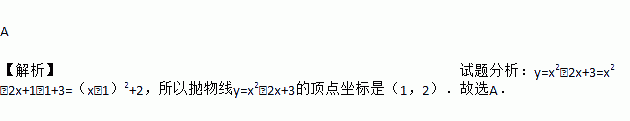 A 【解析】试题分析:y=x2﹣2x+3=x2﹣2x+1﹣1+3=(x﹣1)2+2,所以抛物线y=x2﹣2x+3的顶点坐标是(1,2).故选A.