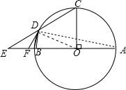 分析 (1)连结OD,如图,由CO⊥AB得∠E+∠C=90°,根据等腰三角形的性质由FE=FD,OD=OC得到∠E=∠FDE,∠C=∠ODC,于是有∠FDE+∠ODC=90°,则可根据切线的判定定理得到FD是⊙O的切线;