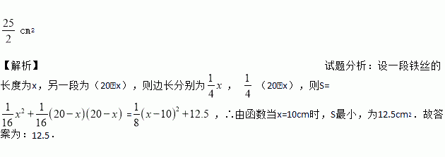 cm2 【解析】试题分析:设一段铁丝的长度为x,另一段为(20﹣x),则边长分别为, (20﹣x),则S==,∴由函数当x=10cm时,S最小,为12.5cm2.故答案为:12.5.