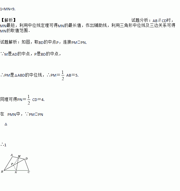 如图,在四边形ABCD中,M、N分别是AD、BC的中点,若AB=10,CD=8,求MN长度的取值范围.
