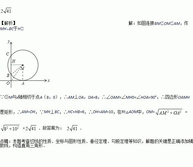 如图,在平面直角坐标系中,⊙与轴相切于点,与轴分别交于点和点,则圆心到坐标原点的距离是__________.