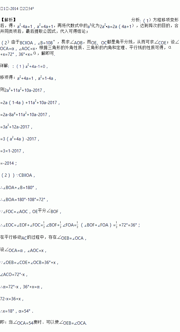 (2)如图,CB∥OA,∠B=∠A=108°,E、F在CB上,且满足∠FOC=∠AOC,OE平分∠BOF,若平行移动AC,当∠OCA= 时。可以使∠OEB=∠OCA。