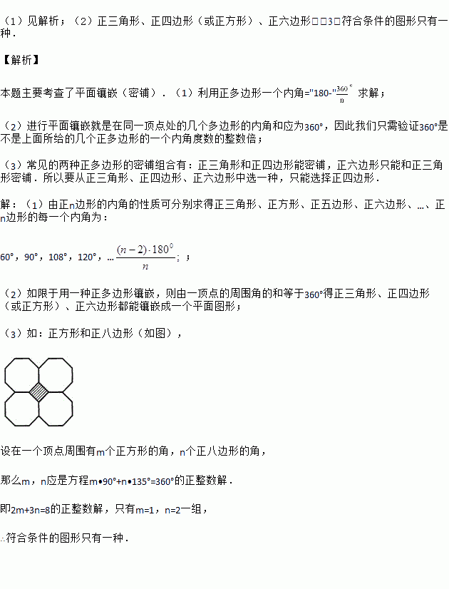 在日常生活中,观察各种建筑物的地板,就能发现地板常用各种正多边形地砖铺砌成美丽的图案.也就是说,使用给定的某些正多边形,能够拼成一个平面图形,既不留下一丝空白,又不互相重叠(在几何里叫做平面镶嵌).这显然与正多边形的内角大小有关.当围绕一点拼在一起的几个多边形的内角加在一起恰好组成一个周角(360°)时,就拼成了一个平面图形.