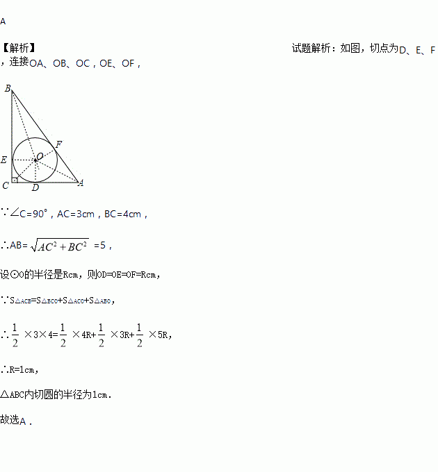 如图,Rt△ABC中,∠C=90°,AC=3cm,BC=4cm,则它的内切圆半径为( )
