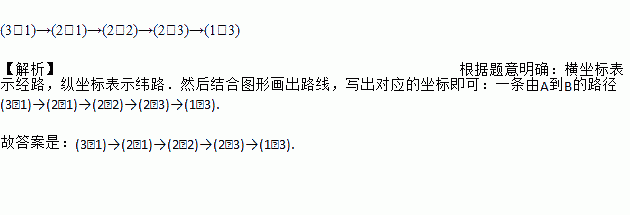 如图,A表示三经路与一纬路的十字路口,B表示一经路与三纬路的十字路口,如果用(3,1)?(3,2)?(3,3)?(2,3)?(1,3)表示由A到B的一条路径,用同样的方式写出一条由A到B的路径:____________________.