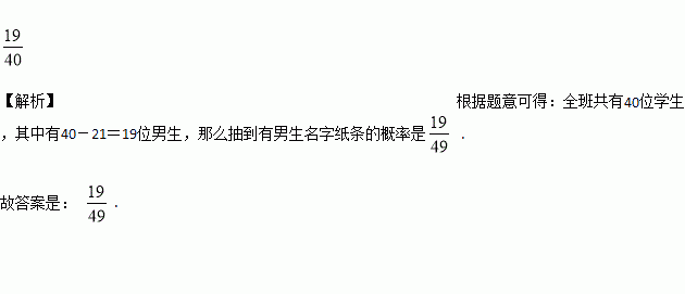 九二班有40位学生,其中有21位女生.在一次活动中,班上每一位学生的名字都各自写在一张小纸条上,放入一盒中搅匀.如果老师随机从盒中随机抽出一张纸条,那么抽到写有男生名字纸条的概率是 ___.