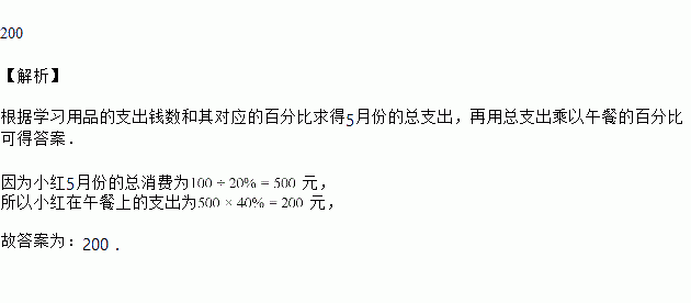 小红同学5月份各项消费情况的扇形统计图如图所示,其中小红在学习用品上支出100元,则在午餐上支出______元