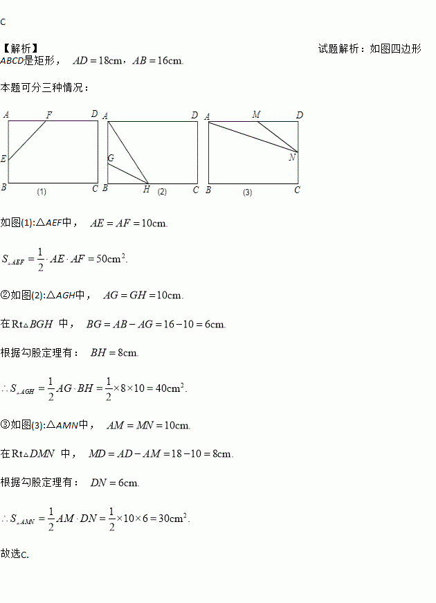 一次数学课上,老师请同学们在一张长为18厘米,宽为16厘米的矩形纸板上,剪下一个腰长为10厘米的等腰三角形,且要求等腰三角形的一个顶点与矩形的一个顶点重合,其它两个顶点在矩形的边上,则剪下的等腰三角形的面积为 ( )平方厘米。